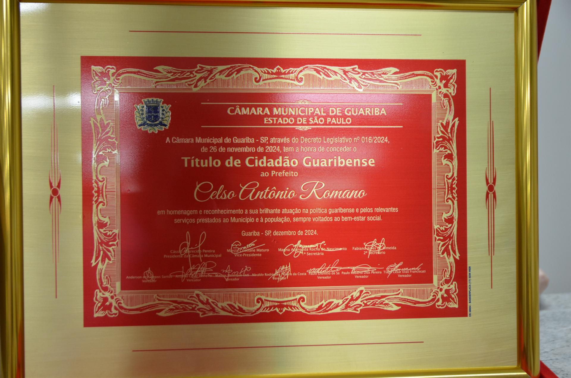 Sessão Solene - Entrega do título de Cidadão Guaribense ao prefeito Celso Antônio Romano