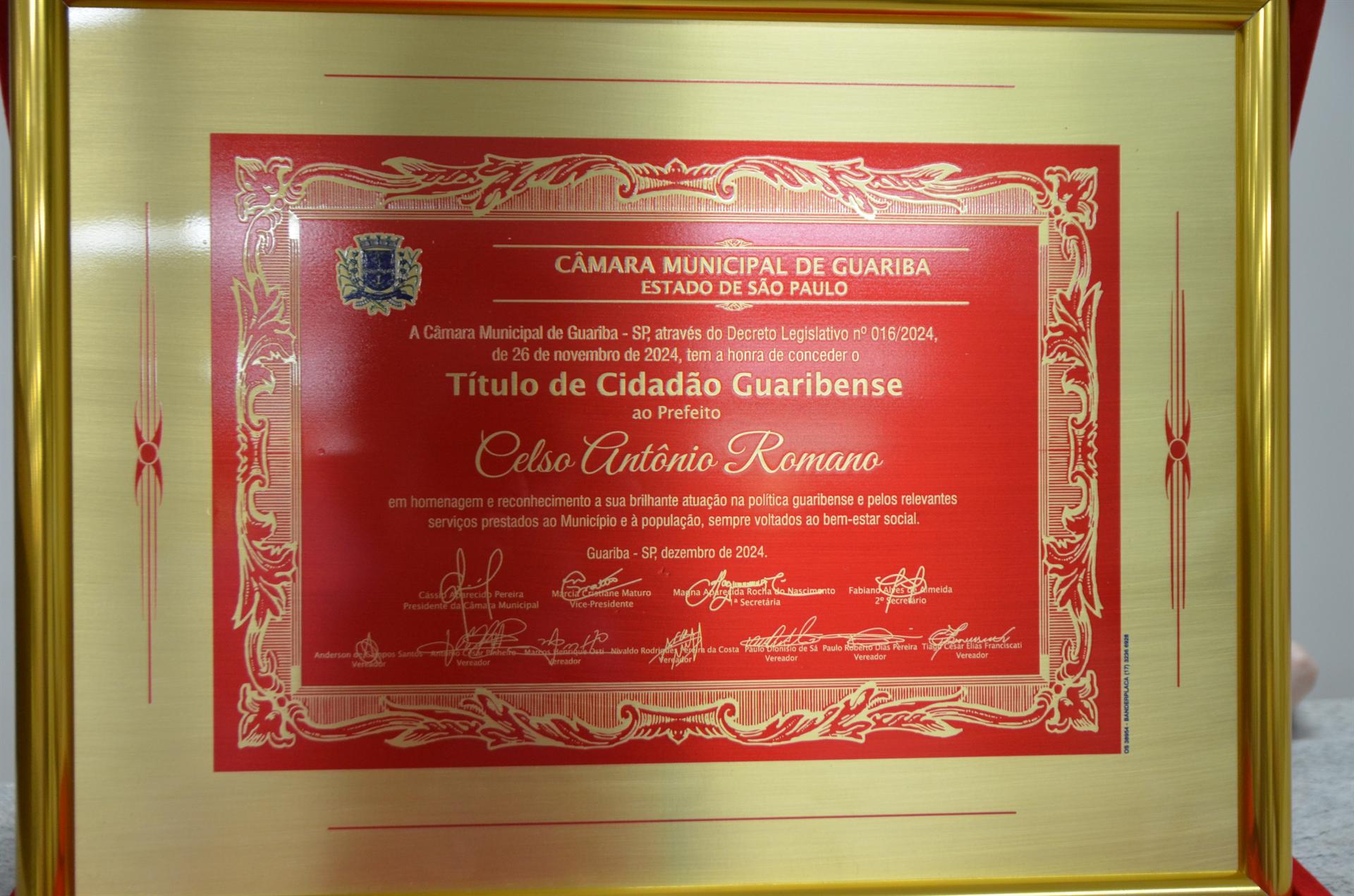 Sessão Solene - Entrega do título de Cidadão Guaribense ao prefeito Celso Antônio Romano